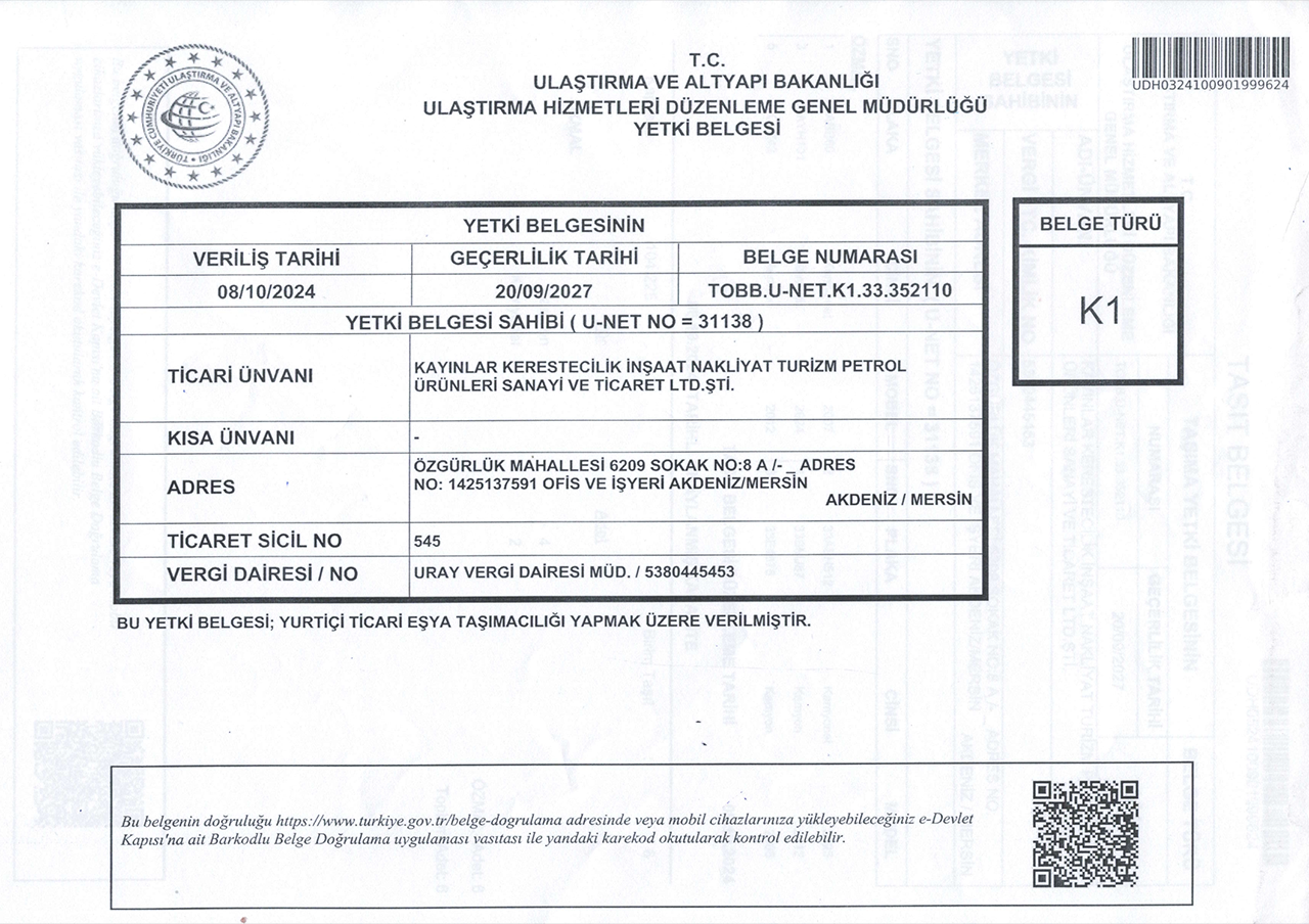 • K2 Yetki Belgesi (21.03.2012): Kara Ulaştırma Genel Müdürlüğü tarafından verilen bu belge ile, firmamızın yurtiçi eşya taşımacılığı yapma yetkisi bulunmaktadır.