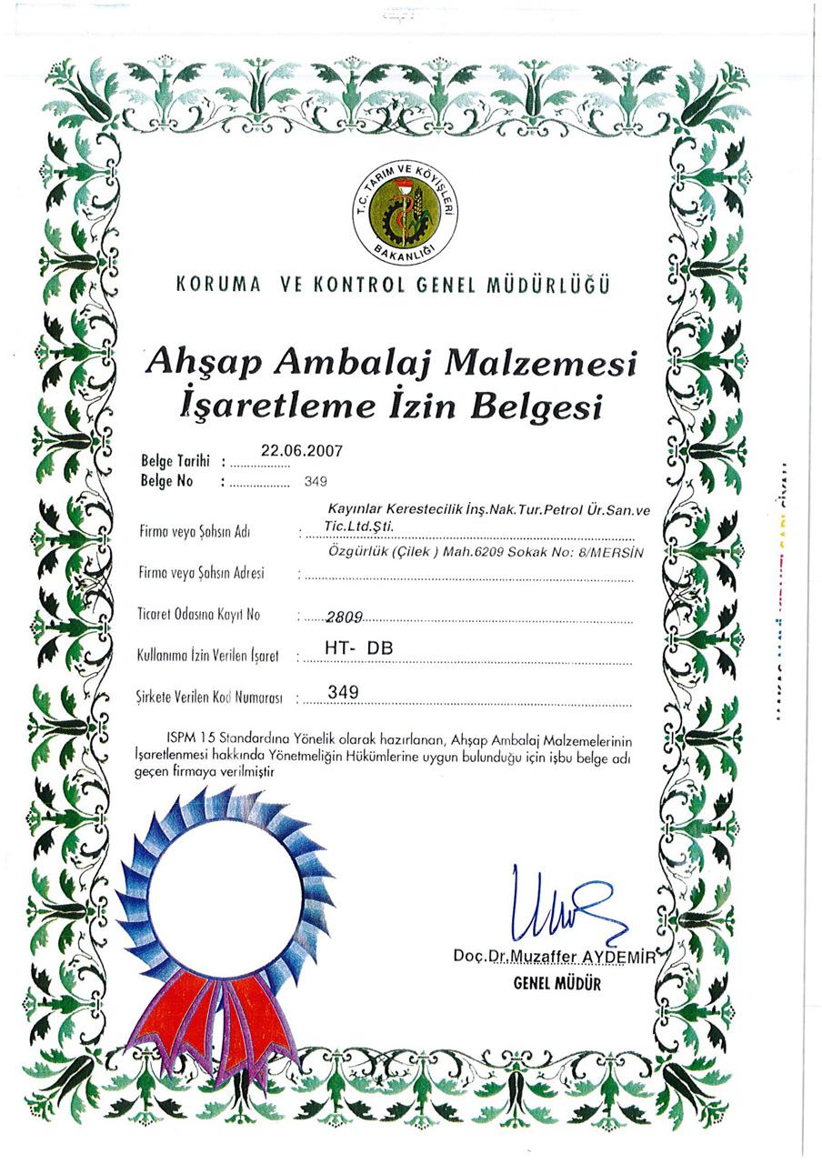 • Ahşap Ambalaj Malzemesi İşaretleme İzin Belgesi (22.06.2007): ISPM-15 standartlarına uygun olarak hazırlanan ahşap ambalaj malzemelerinin işaretlenmesi için izin belgesine sahibiz. Bu belge, ürünlerimizin uluslararası normlara uygun olduğunu göstermektedir.
